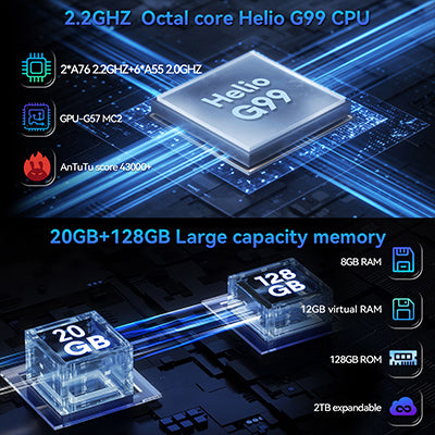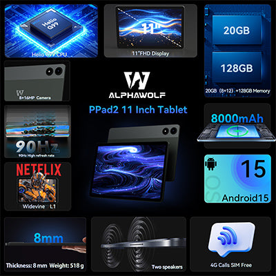 【Ausgestattet mit 20 GB (8 GB + 12 GB virtuell) + 128 GB und Helio G99 CPU】 Das 11-Zoll-Android-Tablet unterstützt 12 GB virtuellen RAM zusätzlich zu 8 GB RAM, mit einer kombinierten großen Kapazität von 20 GB RAM, was einen reibungsloseren Betrieb ermöglicht. Darüber hinaus verfügt es über einen großen integrierten Speicher von 128 GB und mit dem erweiterbaren Speicher einer microSD-Karte (separat erhältlich) können Sie Aktivitäten wie Fotos ansehen, Filme ansehen, Musik hören, an Online-Kursen teilnehmen, Videokonferenzen abhalten und Büroarbeiten ohne Stress erledigen. ◆ Das Alphawof PPad2 ist mit dem MTK G99-Prozessor ausgestattet und verfügt über ein 8-Kern-Design. Es hat einen Antutu-Testwert von über 400.000 Punkten erreicht. In Kombination mit der Mali G57 GPU kann es Spiele und grafikintensive Apps reibungslos ausführen. Es ist auch schneller bei der Bildverarbeitung und Spracherkennung.