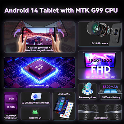 【FHD IPS Screen & Widevine L1 - compliant G99 Tablet】The Alphawolf APad1 Android 14 tablet adopts an FHD display with a resolution of 1920*1200, achieving a higher graphic density in the same area, making colors more vivid and detailed, and enabling you to enjoy an excellent viewing experience. It uses liquid - crystal display technology, providing a wide viewing angle, minimizing color changes and distortion, and having a high response speed. In addition, it comes with two speakers, enhancing the sense of presence when watching videos or listening to music, allowing you to fully enjoy them. ◆ The Widevine L1 - compliant tablet provides more efficient HD and UHD video decoding and supports 1080P HD video playback on major platforms such as Netflix, Amazon Prime Video, Disney+, and Hulu.