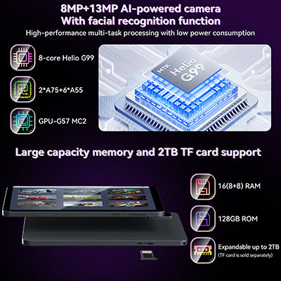 【Equipped with Helio G99 CPU & 16(8 + 8)GB+128GB+2TB Expandable】The Alphawolf APad1 Android tablet is equipped with the MTK G99 processor, adopting an 8 - core design. It has recorded an Antutu test score of over 400,000 points. In combination with the Mali G57 GPU, it can smoothly run games and graphics - intensive apps. It is also faster in image processing and voice recognition. ◆ The 8 - inch Wi - Fi model of the APad1 tablet supports 8GB of virtual RAM in addition to 8GB of RAM. When the memory expansion function is enabled, when the RAM fully reaches 8GB, up to 8GB will be automatically allocated from the ROM. With a combined 16GB of large - capacity RAM, it can be operated more smoothly. Moreover, it has a large - capacity 128GB built - in storage, and with expandable storage up to 2TB using a microSD card (sold separately), you can enjoy activities such as viewing photos, watching movies, listening to music, taking online classes, having video conferences, and doing office work without any stress.