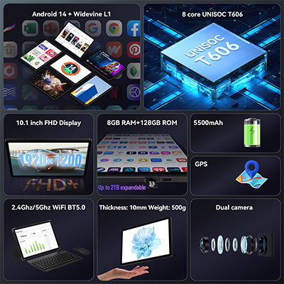 - マルチメディアと接続性のニーズに最適: 10インチのAndroid 14タブレットは、デュアルバンドWi-Fi、Bluetooth、3.5mmジャック、5MP+8MPデュアルカメラを搭載し、優れたパフォーマンスを発揮します。分割画面とワイヤレスキャストで生産性を向上。OTG対応でデバイス間のデータ転送も高速です。さらに、1年間の修理・交換保証と、24時間対応の専用カスタマーサービスとテクニカルサポートも提供しています。