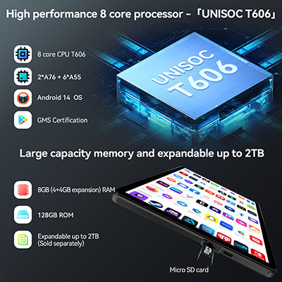 - オクタコアCPU搭載のAndroid 14タブレット:このAndroidタブレットは、A523 CPUを大幅に上回るUnisoc T606 CPUを搭載し、タスクを数倍高速に実行します。最新のAndroid 14オペレーティングシステムを搭載し、マルチタスク機能、カスタマイズオプション、セキュリティ機能、プライバシー保護が大幅に向上しています。