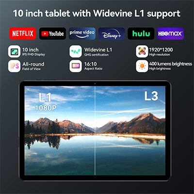 - Eye-Care FHD 10インチタブレット: 1920x1200の解像度を誇る10.1インチFHDディスプレイを搭載したこのゲーミングタブレットは、同じ画面サイズでありながら高いピクセル密度を実現し、より鮮明で精細な色彩、最小限の歪み、そして素早い応答速度を実現しています。Widevine L1認証を取得しており、HDおよびUHDビデオのデコード効率が向上し、Netflixなどの主要プラットフォームで1080P HDビデオの再生をサポートします。