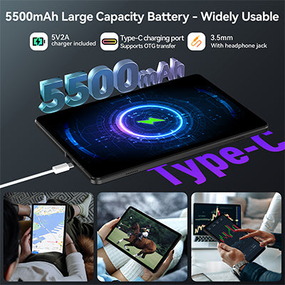 - 長持ちバッテリー:大型Androidタブレットは、5500mAhの大容量コバルト酸リチウムバッテリーを搭載し、標準的なリチウムイオンバッテリーよりも大幅に長いバッテリー駆動時間を実現します。この最先端技術により、耐久性、低消費電力、効率的な発熱を実現しています。Type-C充電の利便性と相まって、外出先でも素早く確実に充電できます。