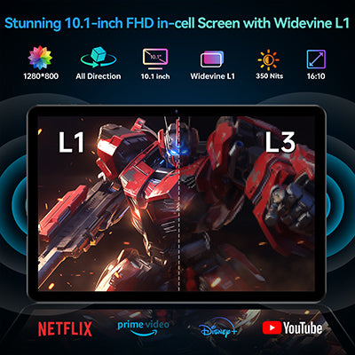 【驚異の10.1インチディスプレイ】鮮やかな800×1280解像度の画面で、クリアな映像をお楽しみください。Widevine L1認証を取得しており、Netflixなどのプラットフォームで1080P HDビデオの再生に対応しています。没入感あふれるエンターテイメントと目の疲れを軽減する視聴体験を重視する電子機器搭載タブレットに最適です。